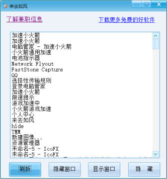 来去如风隐藏窗口软件能隐藏或显示指定的窗口,如自己运行的程序不想让别人看到或让别人关闭,你可以隐藏起来。当自己要操作这个程序时显示相应窗口就行了。