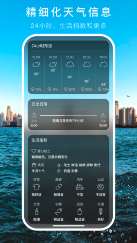 精准提供实时天气、分钟级降水量、未来24小时天气、未来15及40天天气、历史天气、灾害预警、降水概率、空气质量和生活指数等多种天气信息