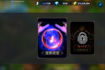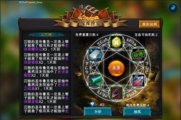 进入宝库后,会召唤一个宝盘,宝盘上有6个道具,玩家点击“抽奖”便可随机获得其中一个道具,类似于抽奖。宝盘是随机召唤的,有品质之分,依次为紫、蓝、绿、白,品阶越高,宝盘上的奖励越高,玩家可以通过中间的“重置”按钮重置宝盘,品质依然是随机的。当然,也可以使用“升阶”按钮直接将宝盘升级至更高的品阶(此操作需要消耗钻石),上面的道具也随之升级。