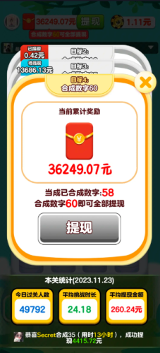 红包奖励提现有两个条件,第一个条件是余额满足0.1元;第二个条件是完成关卡提现目标,比如我在第三关的时候,提现目标就是合成数字35