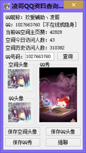 凌哥QQ资料查询器是一款由凌哥推出的免费QQ资料卡查询工具,这款软件可以帮你查询到详细的QQ信息如,QQ空间,QQ头像,QQ相册,在线状态等内容,喜欢玩QQ的朋友们快来试试这款软件吧。