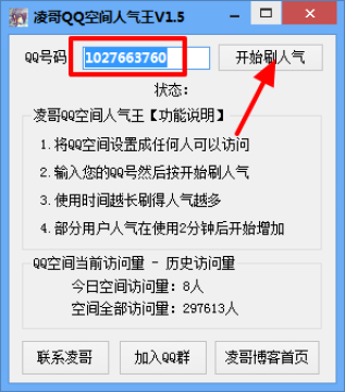 凌哥QQ空间人气王2015是一款最新的QQ控件刷人气软件,这款软件支持完美免小号刷空间人气,软件后台内置大量QQ号,帮助你实时访问您的QQ空间,拥有真实的访问数据,同时软件免登陆,保障您账号的绝对安全!您只需要将空间设置为允许任何人访问即可,另外使用的时间越长,刷得的人气也越多,部分用户人气在两分钟后开始增加,非常好用。