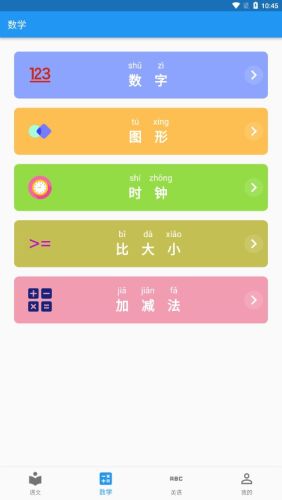 2、在数学的页面中可以进行数字、图形、时钟、比大小、加减法学习;
