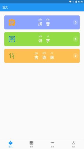 1、打开软件之后会来到语文的页面中有拼音、识字、古诗词方面;