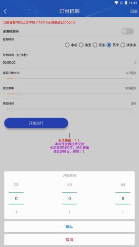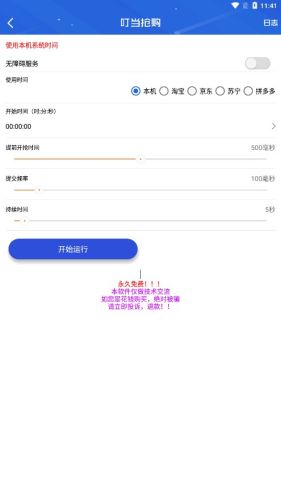 2、进入叮当抢购APP,选择平台、设置开抢时间、提交频率、持续时间,点击开始运行