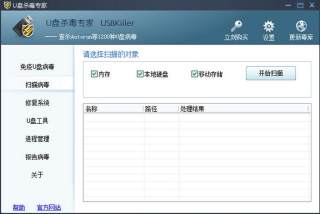 USBKiller通过SBKiller(U盘病毒专杀工具)可检测查杀exe文件夹病,vbs病毒,auturun病毒,u盘文件夹被隐藏等多种U盘病毒,USBKiller(U盘病毒专杀工具)还能提供u盘免疫工具,自动修复因为病毒而损坏的系统配置以及文件。