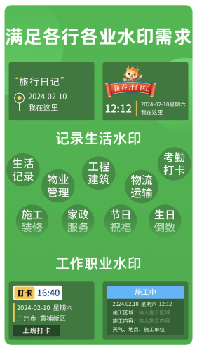 生活通用、考勤打卡、倒数纪念日、物业管理、家政服务、节日祝福、旅游记录、施工装修、工程管理、快递物流等多场景生活工作水印类型,方便用户各种场景打卡,让你我,记录生活,记录工作。