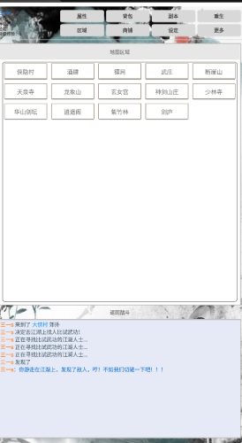 踏入江湖之后,在主界面上方可以了解自己的属性,装备背包,整个副本,区域地图等信息