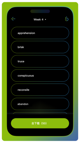 按周学习单词,每周50个单词,可把单词生成壁纸放到手机上,随时随地学习,您身边的英语学习好帮手!