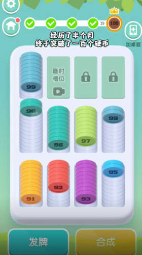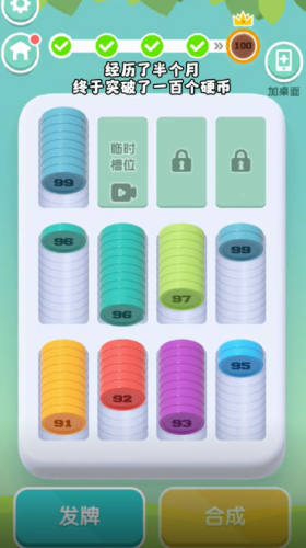 4、指尖操作,堆叠五彩硬币,考验平衡与眼力,越高得分越丰厚。