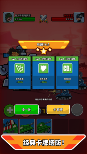 战场补给:Lv.1 生命强化坦克生命+20%;Lv.1 后勤保障回合开始蓝币+10;Lv.1 坦克支援派遣1辆坦克每30秒;请选择你需要的补给。