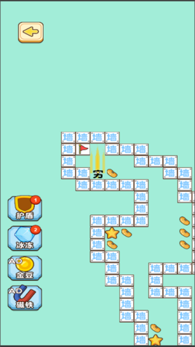 护盾:使自己免受一次伤害,持续5秒;冰冻:使所有陷阱失效,持续10秒;金豆:使所有豆子变成金币(豆子得钱的8倍);磁铁:吸引沿途的道具,持续5秒。