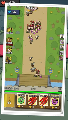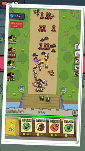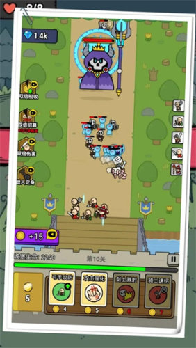 4、玩家可以使用金币购买各种强化技能,农夫速招,射程强化,弓手速招,掉落滚木,等等四个技能强化,每一个技能强化都能大幅度强化士兵;
