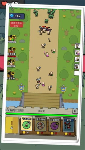 王国保卫战是很常规的左右互推策略游戏,己方城堡血量极低,被推倒获得少量资源用于养成。无数次之后才有可能击败对面,养成资源产出速率非常低,被迫看广告才能变强。