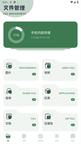 1、在文件当中拥有图片、视频、音频、应用、文档、压缩包等功能可供选择