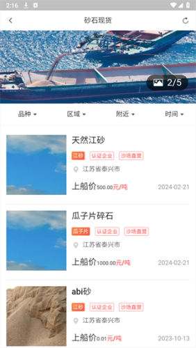 长江砂石手机版app,一款用于查看砂石市场价格的软件,其中拥有多种功能例如平台认证、船找货、货找船、热点资讯、商家地图、砂石商品等,在砂石商品这项功能中,可以根据用户所输入砂石品种、地方区域、附近、时间这几项条件,查找到符合用户需求的商品。软件当中除了砂石商品的售卖,还支持用户查找所需要船只运送的货物订单,只要用户拥有的船只符合平台要求,就可以通过平台上发布的订单联系货主进行接单。这是一款既能了解砂石价格进行下单又能通过运送订单赚钱的软件,感兴趣的朋友可以尝试一下。