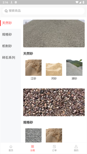 1、进入软件点击砂石商品就能查询到大量的砂石种类