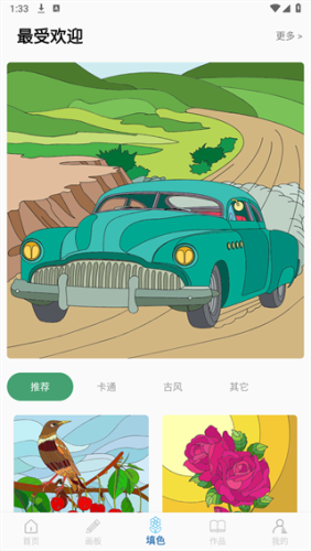 在画板当中完成的绘画,能在填色功能完成作品的填色只需要通过手指点击颜色和要上色的区域就能完成上色