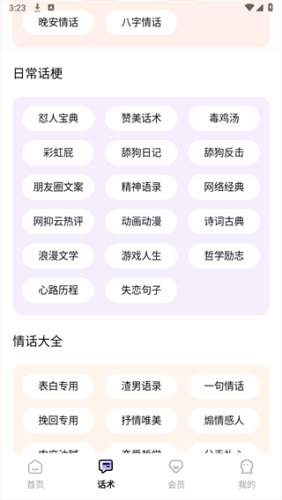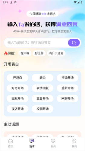 软件当中收录了大量场合都适用的话术,例如开场表白、主动话题、日常话梗、情话大全等让用户告别尬聊