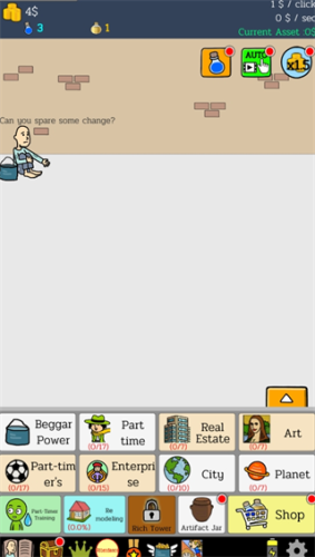 1、游戏的前期玩家需要通过乞讨来获得资金来源,点击屏幕即可获得3个金币。