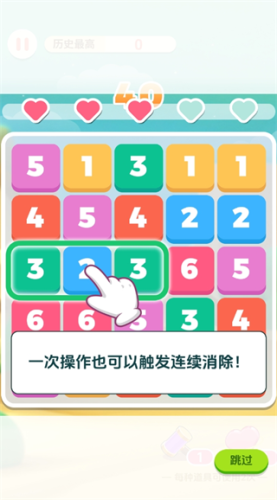 点击相邻的相同数字,再次点击即可两两相消除,他们会在你点击的地方合消除,将相同的数字合并。