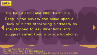 4、游戏中玩家击败小鸟就会触发故事,很久很久以前,有一只鸟,她的身体状况很不好,每拍动翅膀就会喷出熔岩;