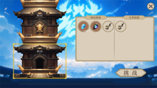 5、训练 一个不动的木桩 统计60秒的伤害详情,点击镇魔塔进入游戏画面,点击第一层,开始挑战,游戏里每一个层都有固定掉落的道具还有几率掉落的道具;