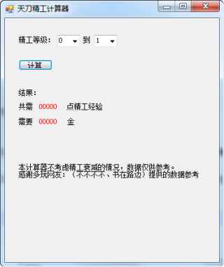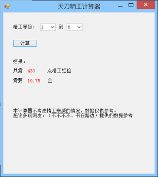 天刀精工计算器是一款计算精工经验的必备小工具,其也内置在多玩天刀盒子中,是最初发布在多玩天刀论坛内的。