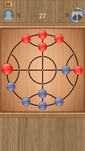 4、棋盘上一个或连成整体的若干棋子,相邻位置被敌方“古领”则这些棋子应立即被提出(即吃掉)一方在棋盘上只剩两个或更少的棋子时,游戏失败,反方胜利;