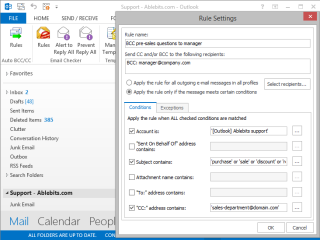 自动密件抄送是很容易理解,容易在Outlook中的工作。事实上,外接做这项工作本身,你只需要创建一个CC或BCC规则。井的条件和例外深思熟虑的系统,可以让你有自动插入一个密件副本或抄送地址: