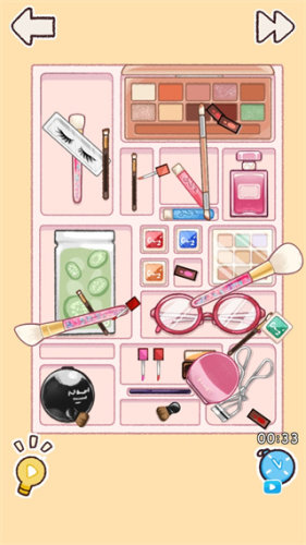 3、 选择第一个关卡即可进入游戏。 玩家在游戏中要做的就是将各种化妆品放在指定的位置。