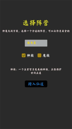 2、点击开始闯关先去选择战斗阵营:神魔大战万载,选择一个合适的阵营,可以让你更安全的;神族:一个注重智力发展的种族,主张维护世间正道,魔族:一个注重力量发展的种族,主张开放自由世界。