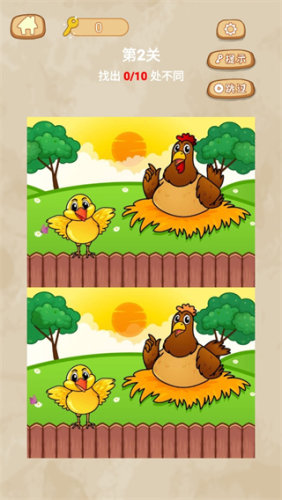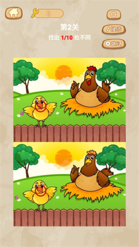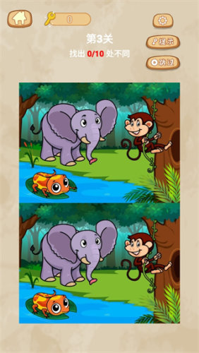 在两张相似的图片中找出不同之处,非常锻炼玩家的观察力和注意力。通过仔细观察,找到10处完全不相同的地方。