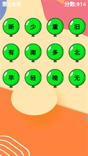 游戏的玩法操作非常的轻松休闲,只需要在气球中根据字的意思,找到另一个意思相反的字即可,简单休闲的玩法适合小鹏们的思想启蒙。