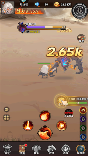 3、通过剧情后玩家们就可以进入游戏主界面啦,游戏里玩家们不需要控制角色进行战斗,所有角色会自动进行战斗,击败敌人获取游戏奖励,使用奖励升级自己的技能;