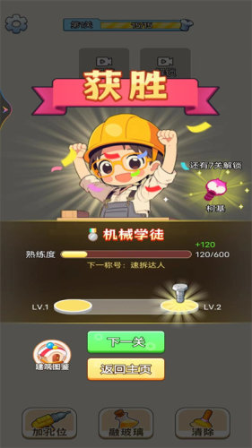 3、在闯关的过程中玩家还可以把所有的螺丝都消除完,还能领取获得新的名称,通过不断的闯关来提升自己的等级。