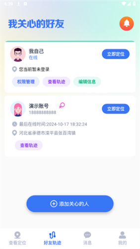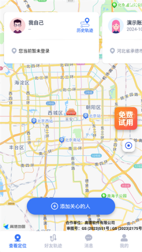 3、好友同意后,开启定位权限,APP保持后台运行,才可以查看好友的定位轨迹位置