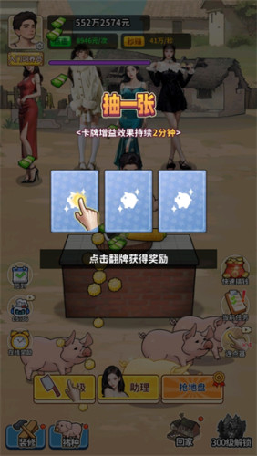 2、点击屏幕进行养猪,不断地获取钞票,然后使用钞票来提升自己的能力,并扩大养殖范围,赚取更多的资金。
