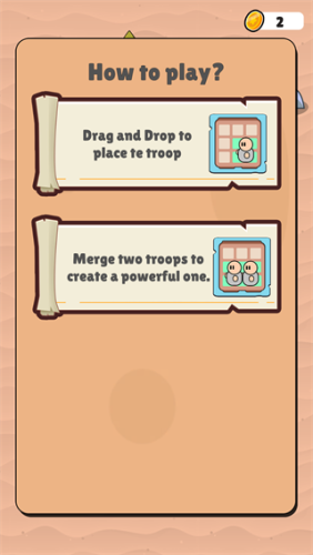 2、玩家们只需要拖动并放置游戏里的各种部队,然后将两个强大的部队合并成为一个更加强大的部队,游戏每过一段时间会生成一块牛排,游戏里释放角色也会消耗牛排;