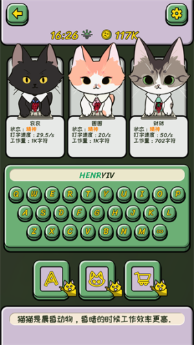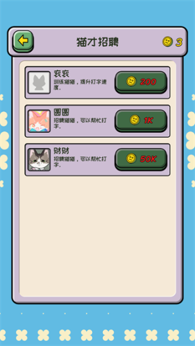2、每一个猫猫都可以帮助玩家们进行打字,玩家们花费的金币越多,打字的猫猫越快,游戏里的猫猫在黄昏时干活的效率越高哦,玩家们还可以开模著作,写出各种各样的书本;