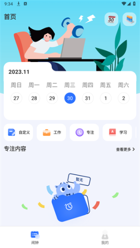 在工作或学习前您可以设置专注闹钟来提醒自己休息或者做其他事情