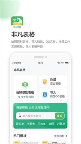 1、打开已下载的非凡表格app,进入首页后可以选择拍照识别表格来创建新表格,或者选择热门的模板进行使用。
