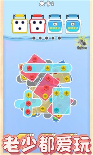 2、在寻找相同颜色螺丝的过程中,注意槽位满后就代表游戏失败,观看广告可以解锁新的工具箱摆放的位置,完成给出的目标任务解锁下一关。