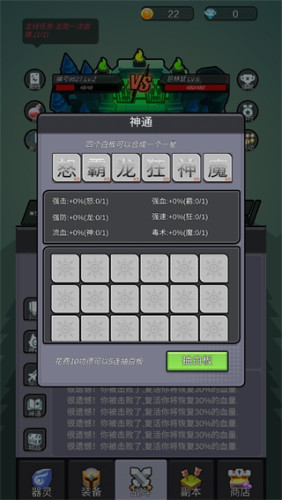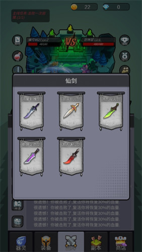4、正中央式是战斗界面,显示玩家即将面对的怪物和当前所在的地点,下面文字是玩家所获得的奖励,可以前往副本升级打怪。