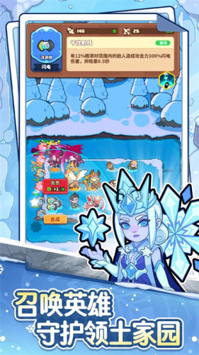 快来当领主小游戏版是一款以极寒雪地为背景来双人策略防御合成类的休闲游戏,这个游戏需要玩家扮演领主的身份来进行防御,通过在冰雪的世界中来组建队伍,与自己的好友一起来合成战斗,合成武器装备来提升等级,利用挂机式的攻击方式来自动战斗,使用银币购买英雄,注意召唤的英雄有普通、精英、稀有、传说四阶,三个同样的英雄可用于合成,消灭BOSS可获得幸运币。