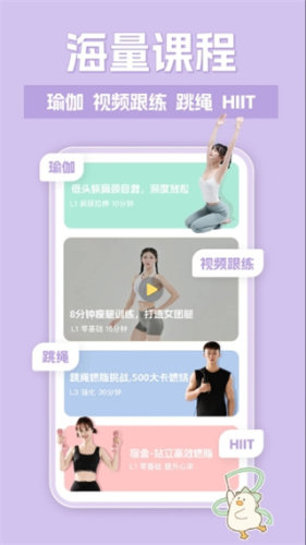 动起来鸭APP提供了多种类型的健身课程,包括瑜伽、高强度间歇训练、普拉提等,满足不同用户的锻炼需求,课程按照类型、难度级别、时长等进行分类,方便用户快速找到适合自己的课程。