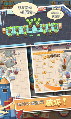 在游戏里还可以通过不断的旋转破坏公司,点击屏幕还能去切换角色位置,快速移动角色打老板;