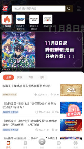 万代卡牌app,一款专门为集卡爱好者准备的赛事软件,内置详细的卡牌比赛和社交功能等,不管是用户想要寻找赛事信息还是查看实时的卡牌排名,都嫩挂在这里找到属于自己的爱好,是铁粉玩家必备的平台。此外,万代卡牌中还能实时查阅各种比赛的报名和进行情况,搜索喜欢的赛事,及时参与报名,不错过每一场精彩的比赛,将进行中的卡牌娱乐赛实时掌握!