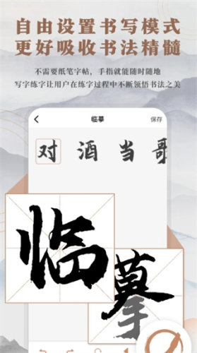 书法临帖练字掌上必备app中提供各种经典碑帖和多种字体,用户可以直接在手机上使用手指进行临摹练习,在练习时软件还会提供辅助线和示范字来帮助更准确地模仿书法作品。