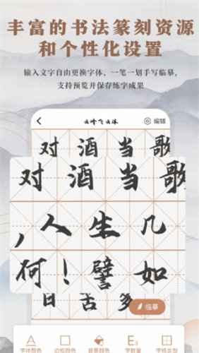 用户可以通过该应用自由输入文字并更换字体,实现从普通文字到书法字体的转换。这一功能不仅增加了练习的趣味性,也方便了用户对不同字体效果的预览和选择。